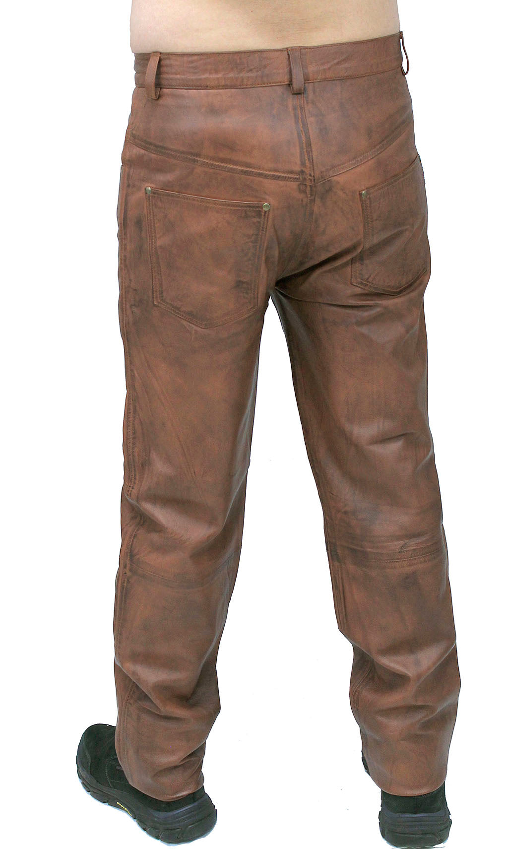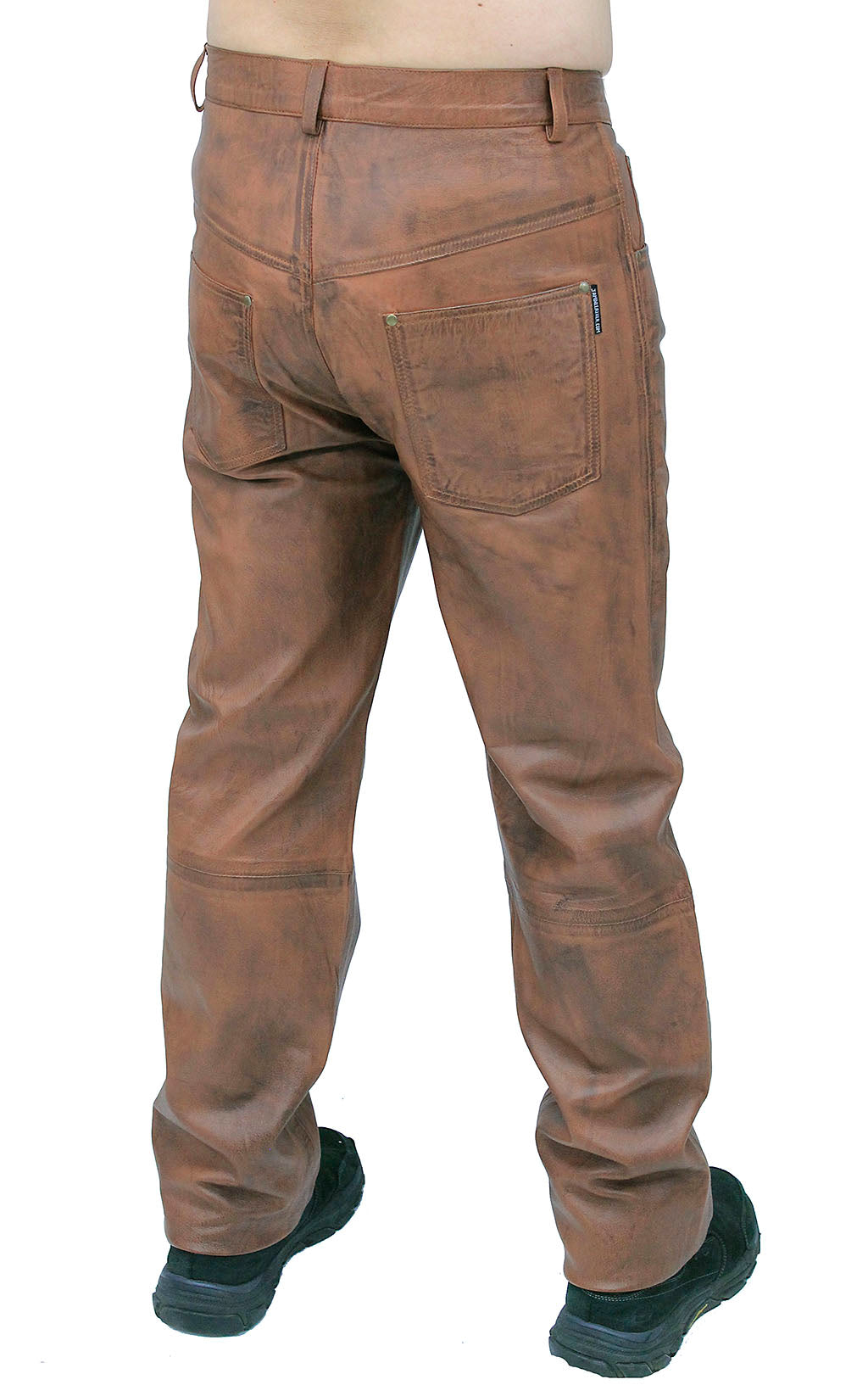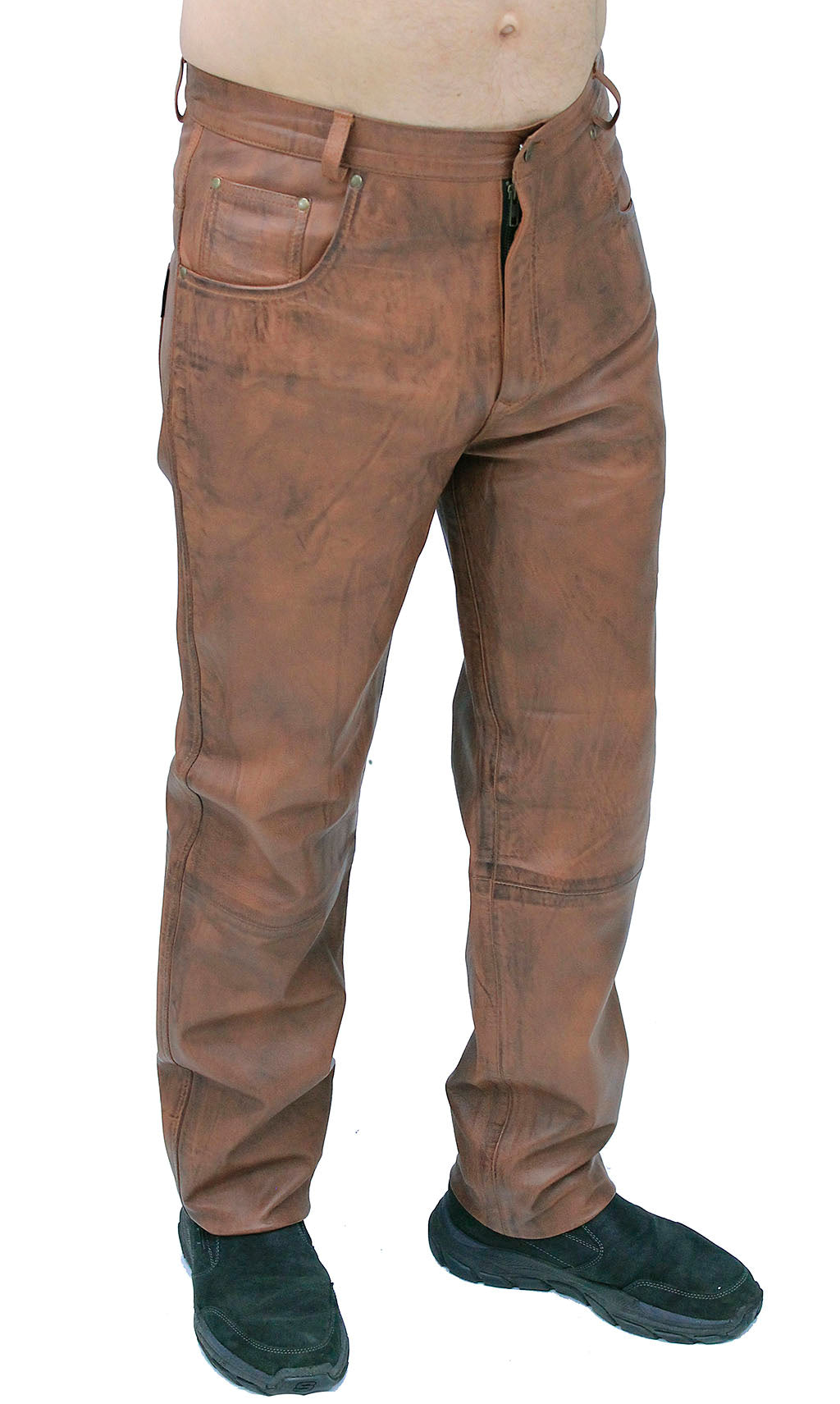 Antiqued brown leather pants made of super soft lightweight lambskin leather. These hand rubbed men's leather pants are for someone looking for exclusive. The fit is between a regular and slim fit pattern. The hand rubbed finish gives each piece it's own unique look. A classic 5 pocket jean style in a slimmer pant style that comes with a soft nylon lining, wide belt loops, zip and button fly, patch rear pockets and three front pockets. Easy to trim to length with a household shears. A 34-35" inseam. Sizes: 32, 34, 36, 38, 40, 42. +$10 for 42. [5#]