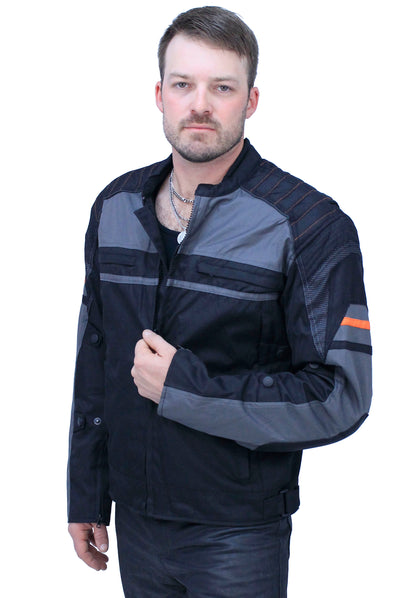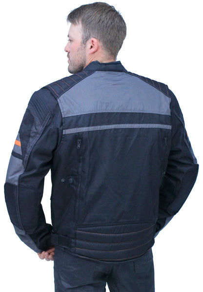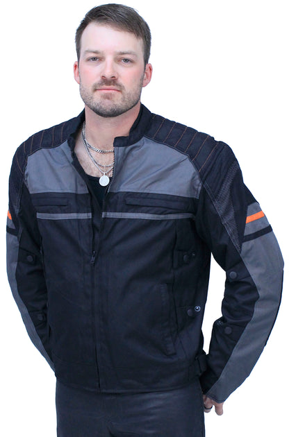 Men's black, gray and orange lightweight jacket with elbow, shoulder and back pads along with reflector trim for nighttime riding. Also comes with a zip out lining and zipper vents for hot weather riding. An ideal motorcycle riding jacket for all seasons. A heavy nylon men's jacket is made of durable heat, water and abrasion resistant nylon, with a full sleeve zip out lining, front and back zipper vents, zip pockets to keep your stuff inside, tow inside concealed pockets with barrel loops, two inside phone pockets, mandarin collar, zip cuffs, adjustable waist straps, and adjustable snap tabs on side and arms for fit adjustment. Sizes: S, M, L, XL 2XL, 3XL, 4X, 5X. +$10 for 2X-3X, +$20 for 4X-5X. [4#]