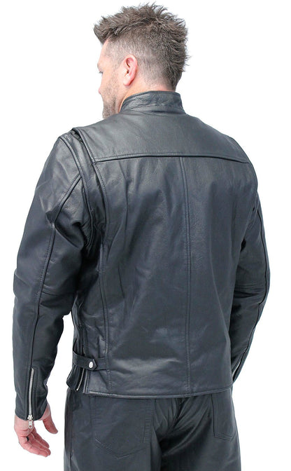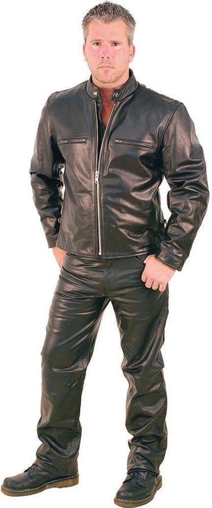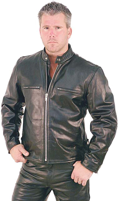 Slick looking men's leather moto jacket, a cafe' racer style jacket with zip out lining gives you a great non-flashy classic look. This black men's biker jacket made of top grain 1.3 mm black buffalo leather. Features include 2 front chest zippered pockets, mandarin snap collar, zippered cuffs, 2 inside chest pockets and a zip out lining. Exclusive Jamin Leather® Brand moto jacket. Sizes: 38, 40, 42, 44 , 46, 48, 50, 52, 54. +$10 for 48-52, +$20 for 54. [7#]
