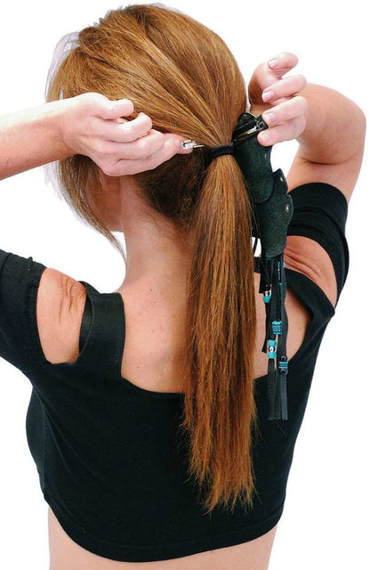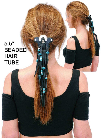 Ideal for riding to keep your long hair from knotting up from the wind. Attractive beaded hair wrap with a hair barrette that will hold it in place. Comes in three sizes, 4" (overall 11" with fringe) with one snap back, 7" (overall 14") with three snaps on back, and 10" (overall 16") with 5 snap wraps on back. Made of top grain cowhide leather. Made in USA. [.5#]