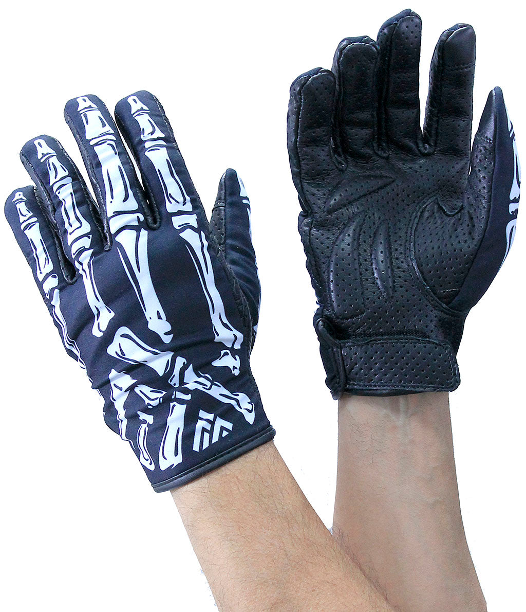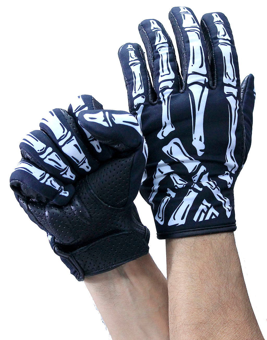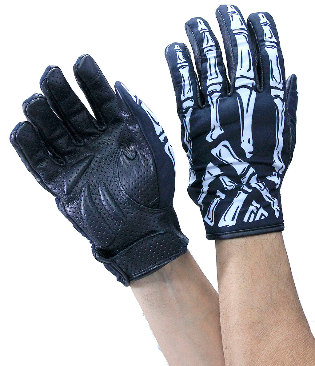 Super comfortable skeleton hand gloves with perforated leather gel padded palms. Skeleton backing on light neoprene make the gloves extra comfortable and flexible. The breathable leather grip side makes it ideal for warmer weather riding. The gel pads in the palm help with vibration, helps prevent fatigue while riding long distances, and improves your grip. Gloves also come with cell phone fingertips.  Quality leather gloves with that is comfortably neoprene and soft cowhide leather with a soft satin lining. Sizes M, L, XL, 2X. [1#]