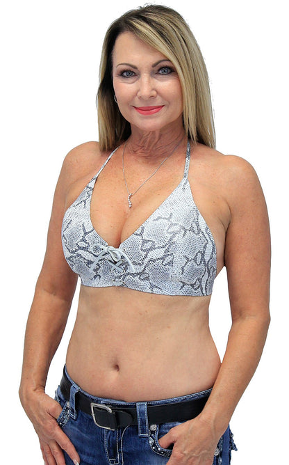 Snakeskin leather bikini top halter top made of comfortable top grain, white snake imprinted lambskin leather. This snakeskin halter top is a universal fitting top that laces up front ties around the neck and back for a perfect fit. Front lacing can be loosened up for improved fit or effect. An exclusive form flattering design by Jamin Leather. Made in USA. [1#]