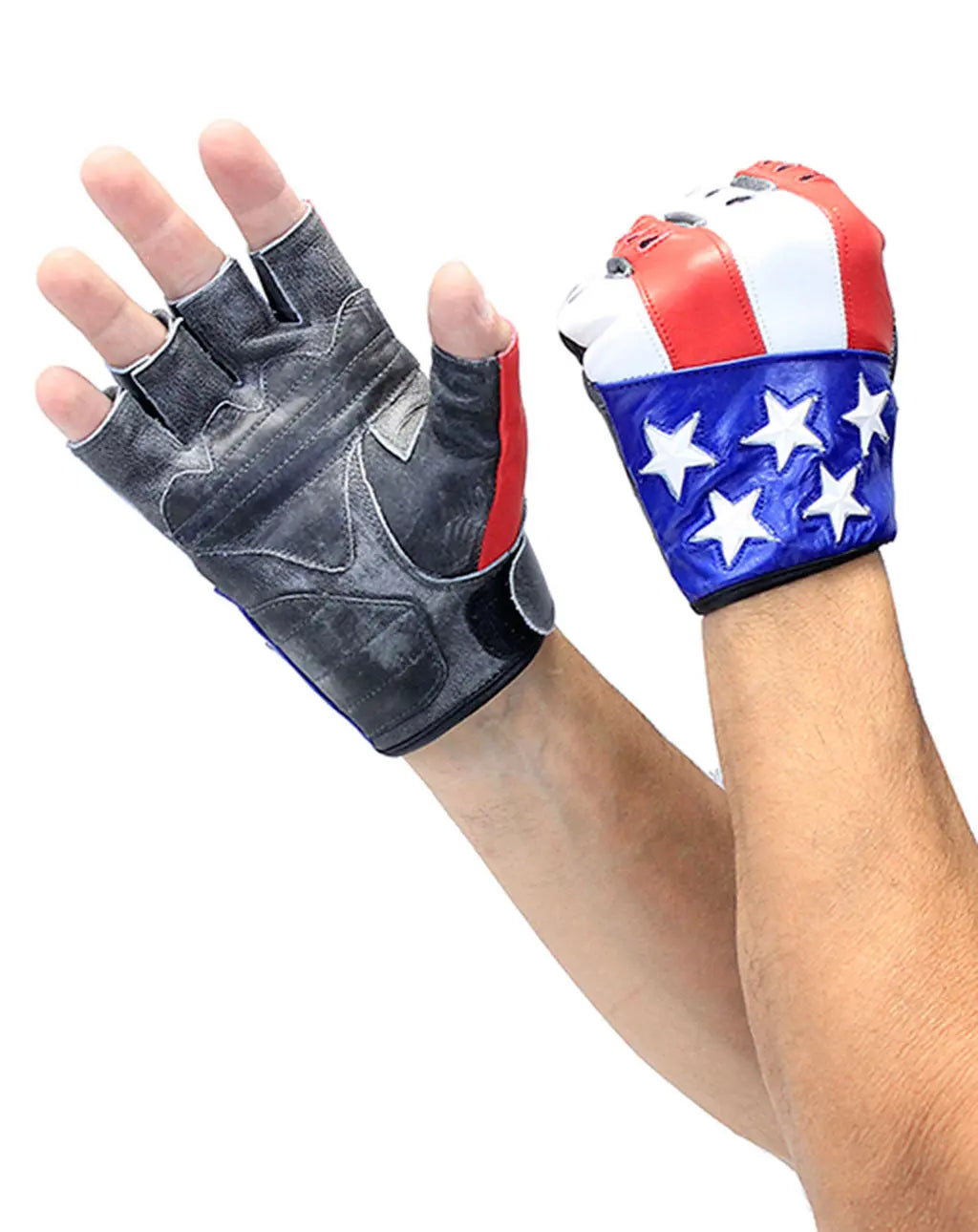 USA stars and stripes decorate this pair of fingerless gloves. These fingerless flag gloves come with a reinforced gray palms and made of comfortably soft and durable cowhide leather. These flag gloves are half gloves that keep your hand protected and allow your finger to touch and grip the things you can't with full fingered gloves. The other features include a wide adjustable wrist strap keeps it secure, reinforced palm, and a soft lining. Sizes S, M, L, XL, 2X, 3X. [1#]