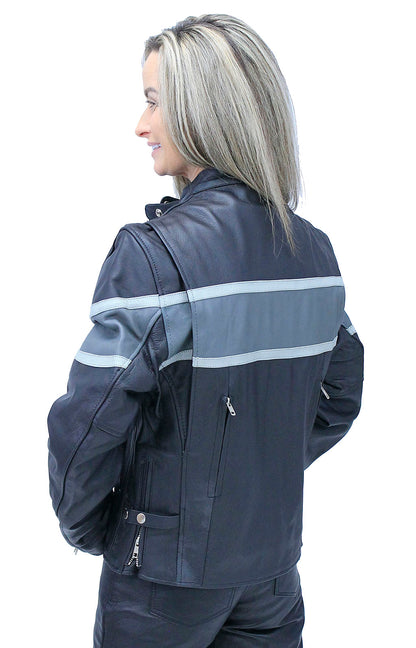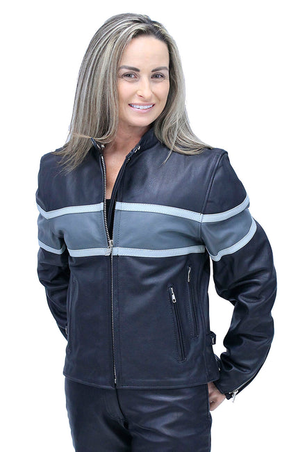 Gray stripe leather jacket in a classic scooter style with zipper vents on both sides and back. A women's motorcycle jacket made of comfortable yet heavy buffalo leather. This women's leather jacket with two-tone gray stripes all around is on sale at a blowout price and comes with a mandarin stand up collar, zip front pockets to keep your stuff in, two inside vertical entry chest pockets, zip cuffs to keep the wind out, zip sides for sitting comfort and a full sleeve zip out lining. Ideal riding jacket for the ladies. Sizes may run small. Sizes: S, M, L, XL. 2X, 3X. +$10 for 2X-3X. [6#]