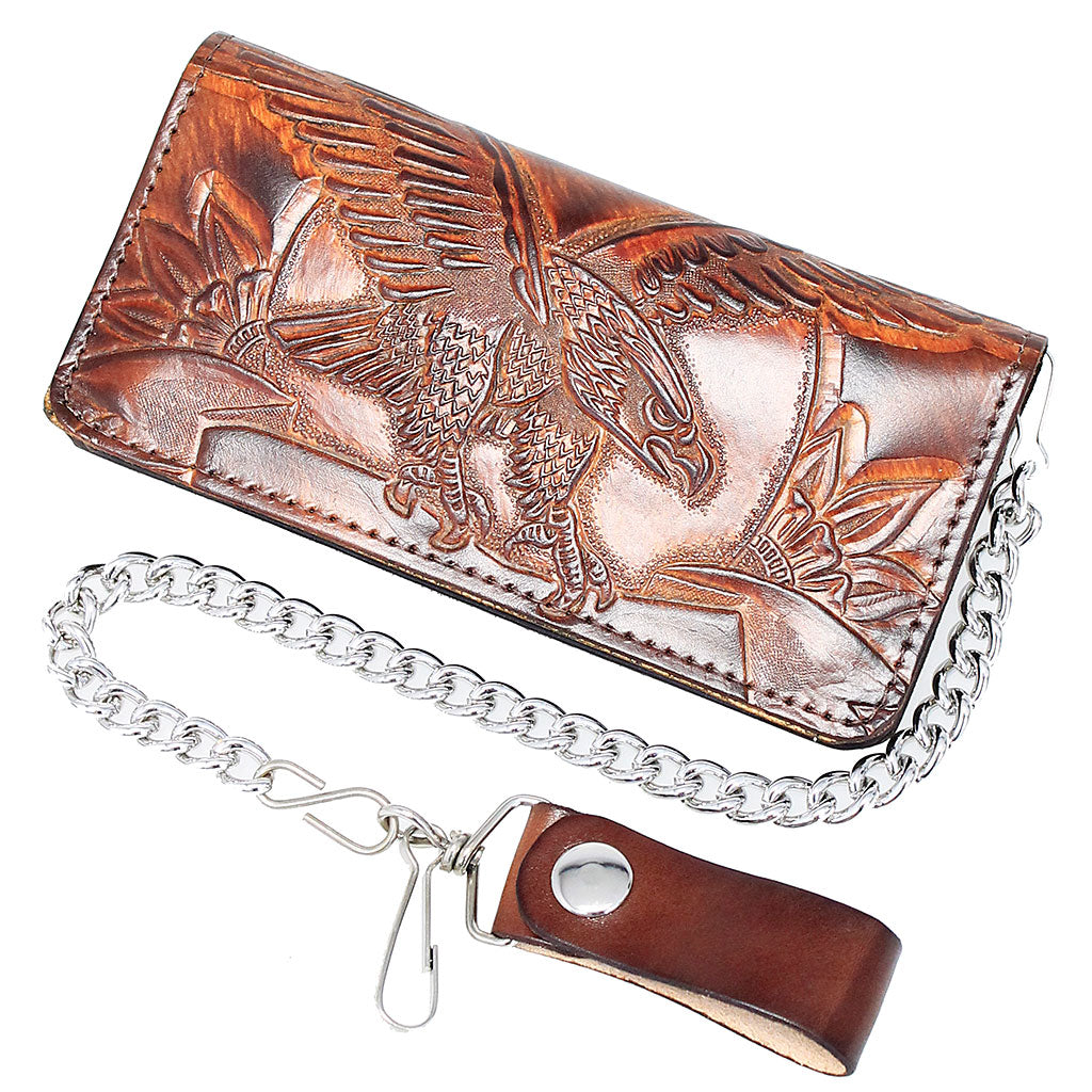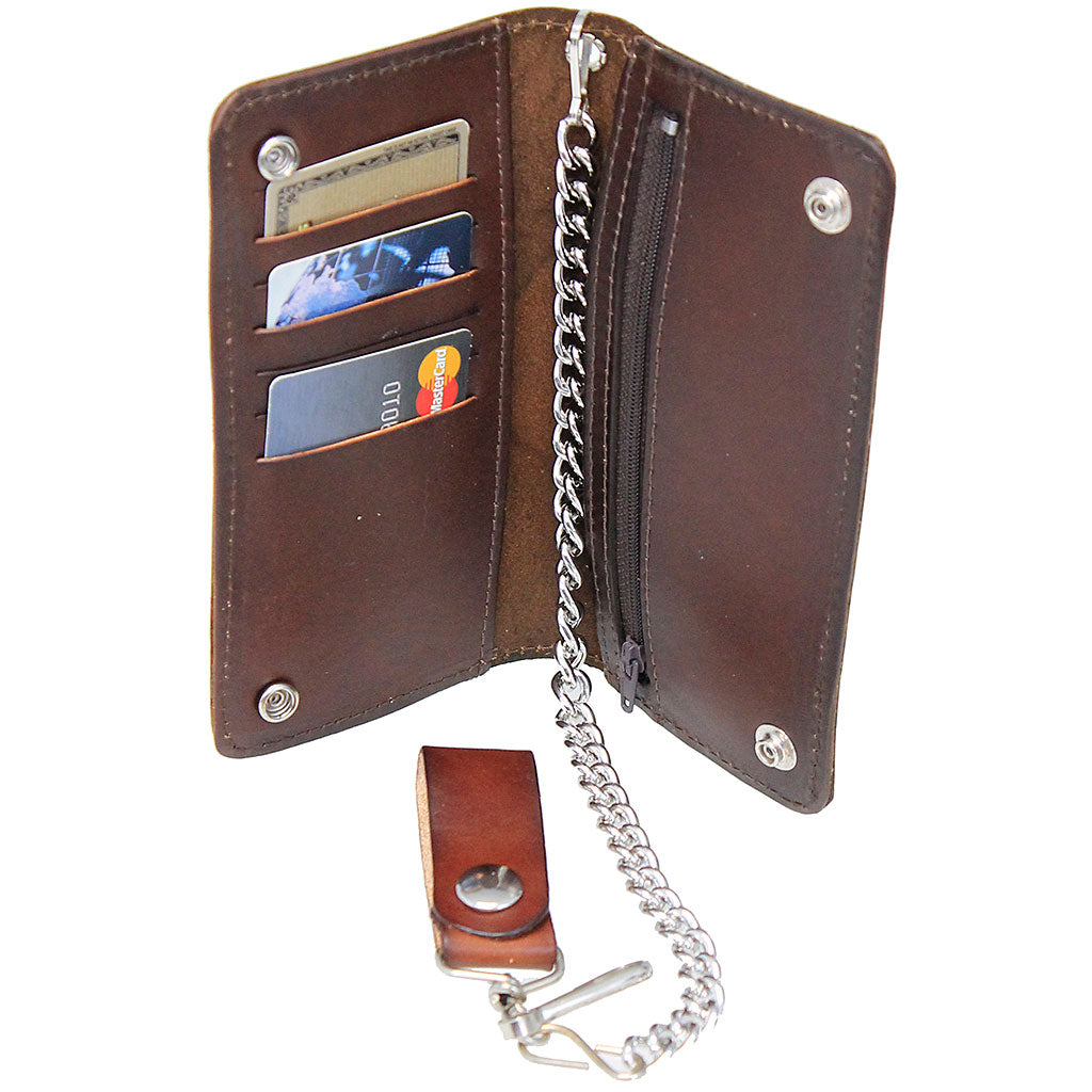 Vintage brown leather bifold chain wallet with eagle embossing, 12 inch chain, leather belt loop and clip for your keys. This tall leather chain wallet measures 3.5 x 7 inch closed. A bifold chain wallet with double snap closure, 5 card slots, 2 bill compartments and one inside full width zipper for your change, keys or other stash. A long lasting biker wallet made of firm top grain cowhide leather with an antiqued finish for that well loved look. [2#]