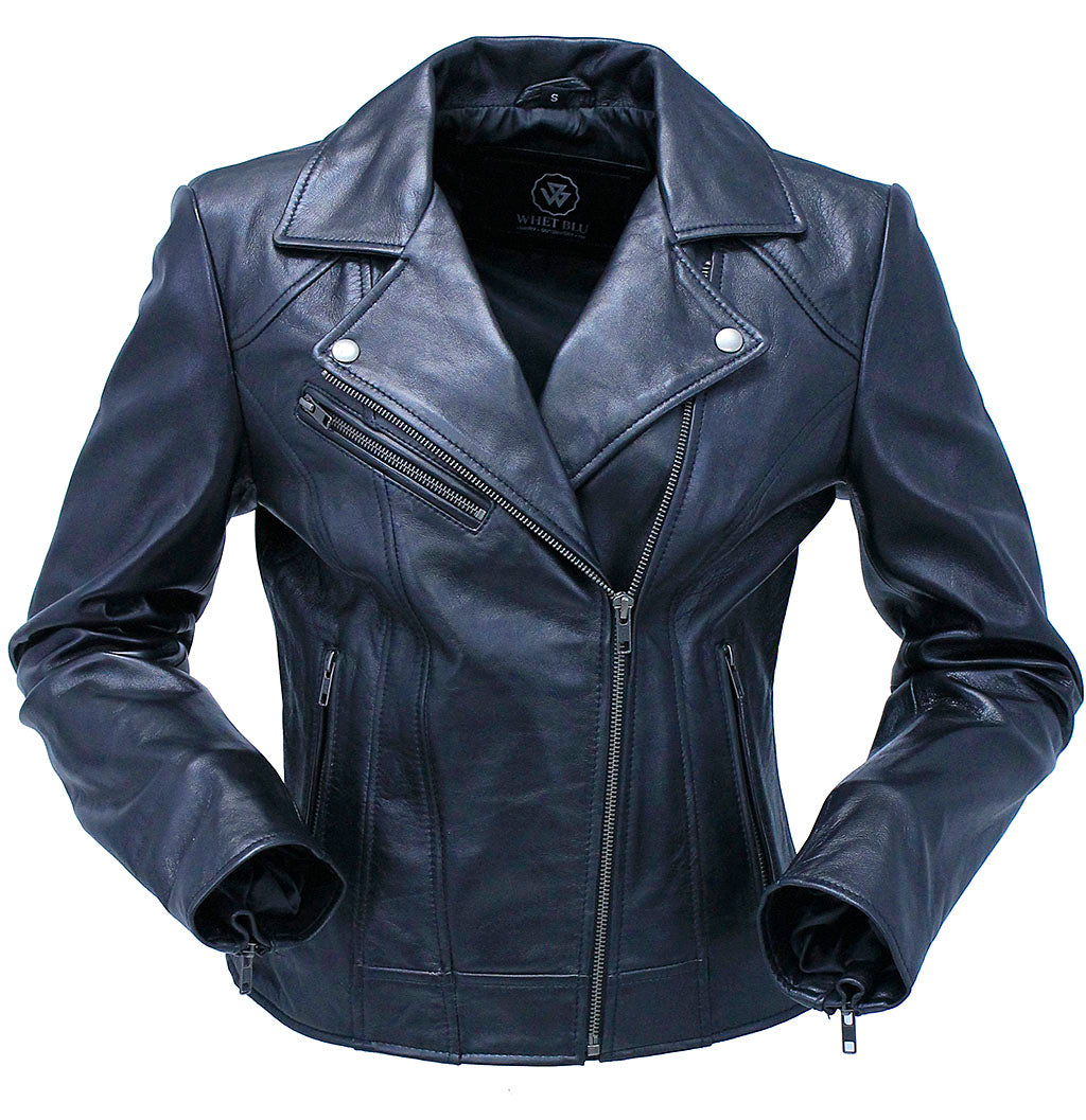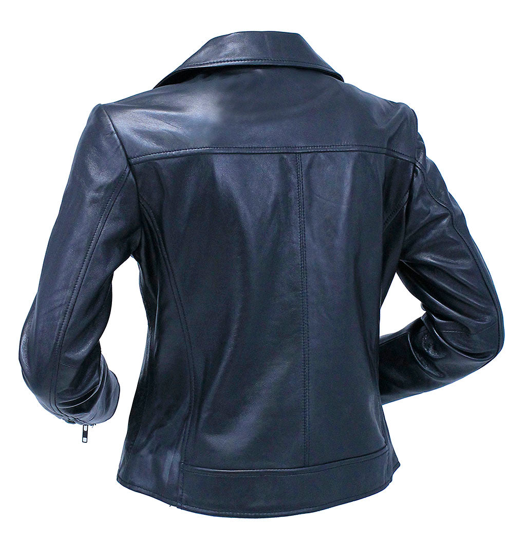 Don't come any nicer! Superior quality soft lambskin leather motorcycle jacket for women. This women's black leather motorcycle jacket with no belt that can scratch your tank. A classic style women's lightweight motorcycle jacket that is very popular these days in everyday fashion. This biker jacket comes with snap down collar, asymmetric front zipper, three zippered front pockets, zipped cuffs, soft satin lining and made of the softest lambskin leather available. Sizes: S, M, L, XL, 2X, 3X, 4X, 5X. +$10 for 2X-3X, +$20 for 4X-5X. [5#]